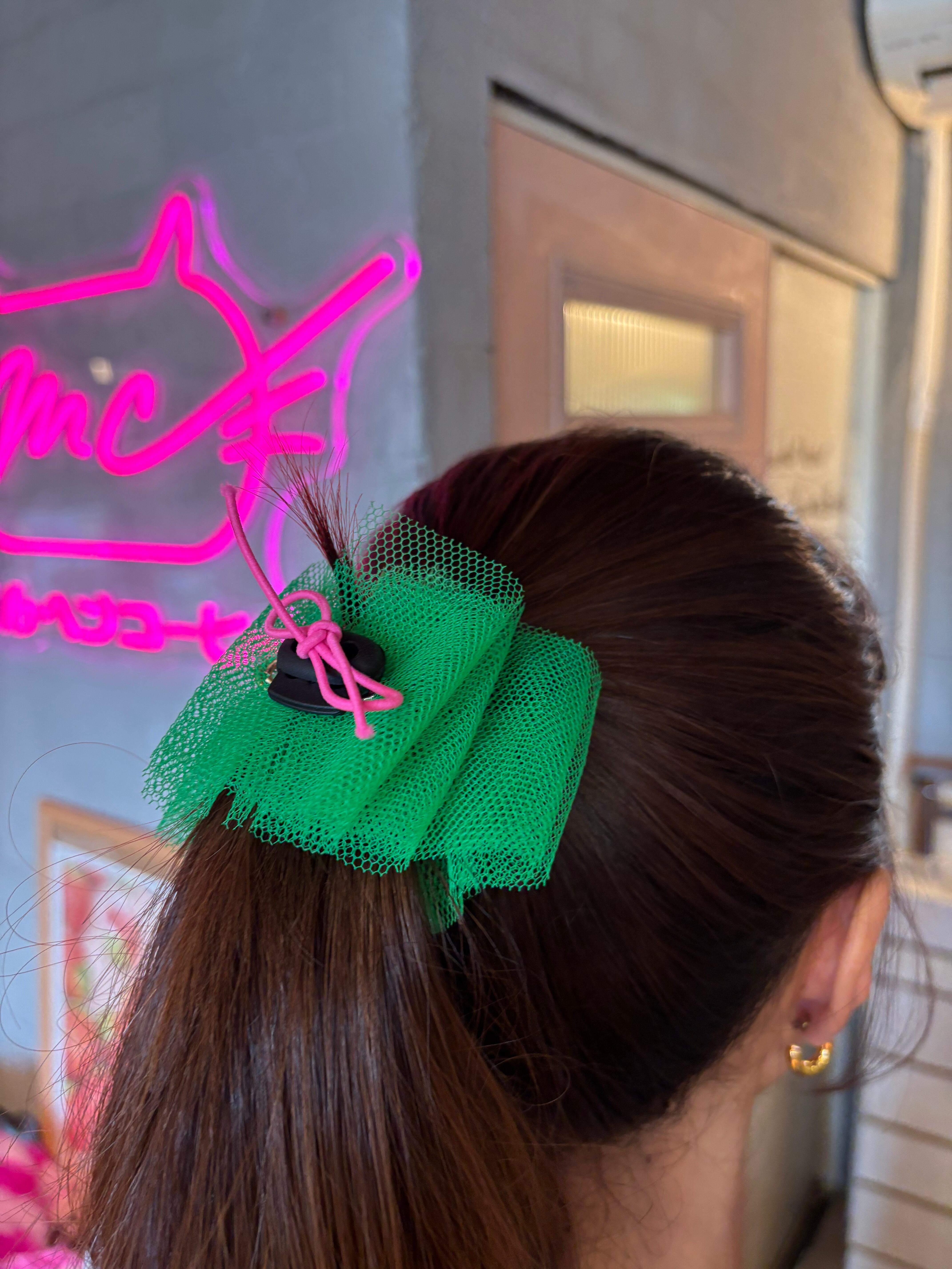 鮮やかなネオンカラーのハードチュールを使ったシュシュです。ドローコードとハトメがポイントになっており、かわいさの中にも個性を感じさせるデザインとなっています。どんなヘアスタイルにもアクセントを加えてくれるアイテムです。